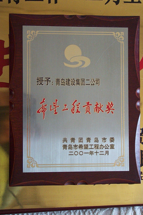 2001年為希望工程捐款20萬元,援助西部貧困山區(qū)建設(shè)希望學(xué)校,被團(tuán)市委、青島市希望工程辦公室授予“希望工程貢獻(xiàn)獎(jiǎng)”