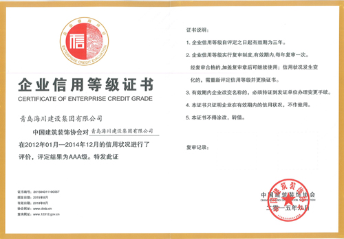 近日,海川集團(tuán)從中國建筑裝飾協(xié)會(huì)捧回“企業(yè)信用評(píng)價(jià)AAA級(jí)信用企業(yè)”獎(jiǎng)牌和證書。該證書是中國建筑裝飾協(xié)會(huì)對(duì)海川集團(tuán)在2012年1月—2014年12月的信用狀況進(jìn)行評(píng)價(jià),并評(píng)定為AAA級(jí)后于2015年8月予以頒發(fā)的,有效期三年,至2018年8月。